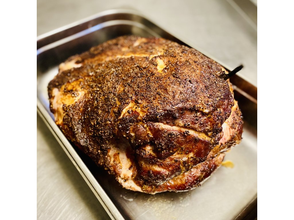 Vánoční šunka bez kůže a kostí - vepřová kýta bez nožičky, s medovou glazurou, pečená na ohni. Naše domácí, vepřová šunka z celé kýty, kterou pro nás upravujíí v Maso Klouda. My ji vykostíme, nakořeníme hořčicí, solí, pepřem a česnekem a upečeme na ohni v naší udírně Southern Pride. Na závěr potřeme medovo-hořčičnou omáčkou a ještě krátce zapečeme. Maso, kouř a spousta chuti. Vyzkoušejte ji třeba s čerstvým chlebem a máslem. Dobrou chuť!